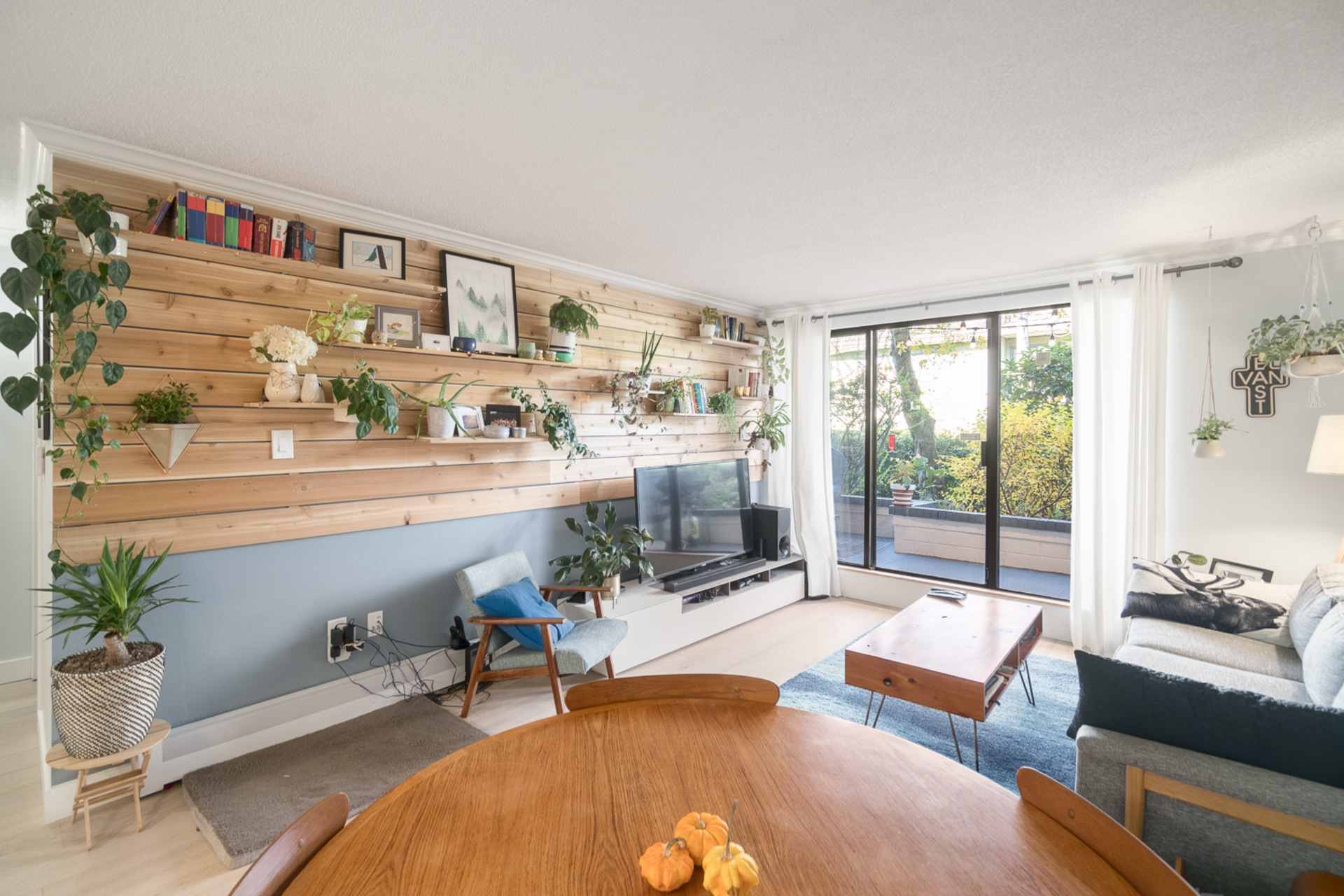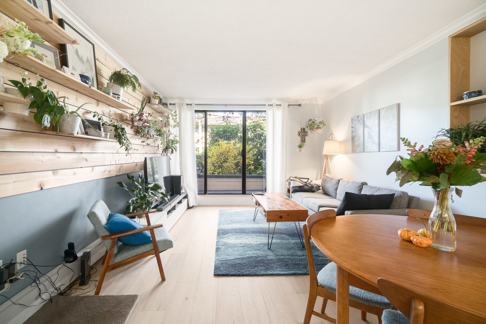 Beautifully renovated one bed/one bath unit at McAllister House in a quiet and serene pocket of Mount Pleasant. Easily entertain guests in your large and open updated kitchen with brand new s/s appliances, quartz countertops, matte subway tile backsplash and sizeable island! Feel that west coast style and charm throughout the home with extensive use of natural materials including brushed oak flooring, stunning custom wood feature wall, post and shelving. From the living area, walk out and enjoy fresh air and lush gardens on your partially covered private patio with custom seating, day or night! Parking and storage included and one pet welcome in this well managed building that's just minutes to schools, transit, parks and shops