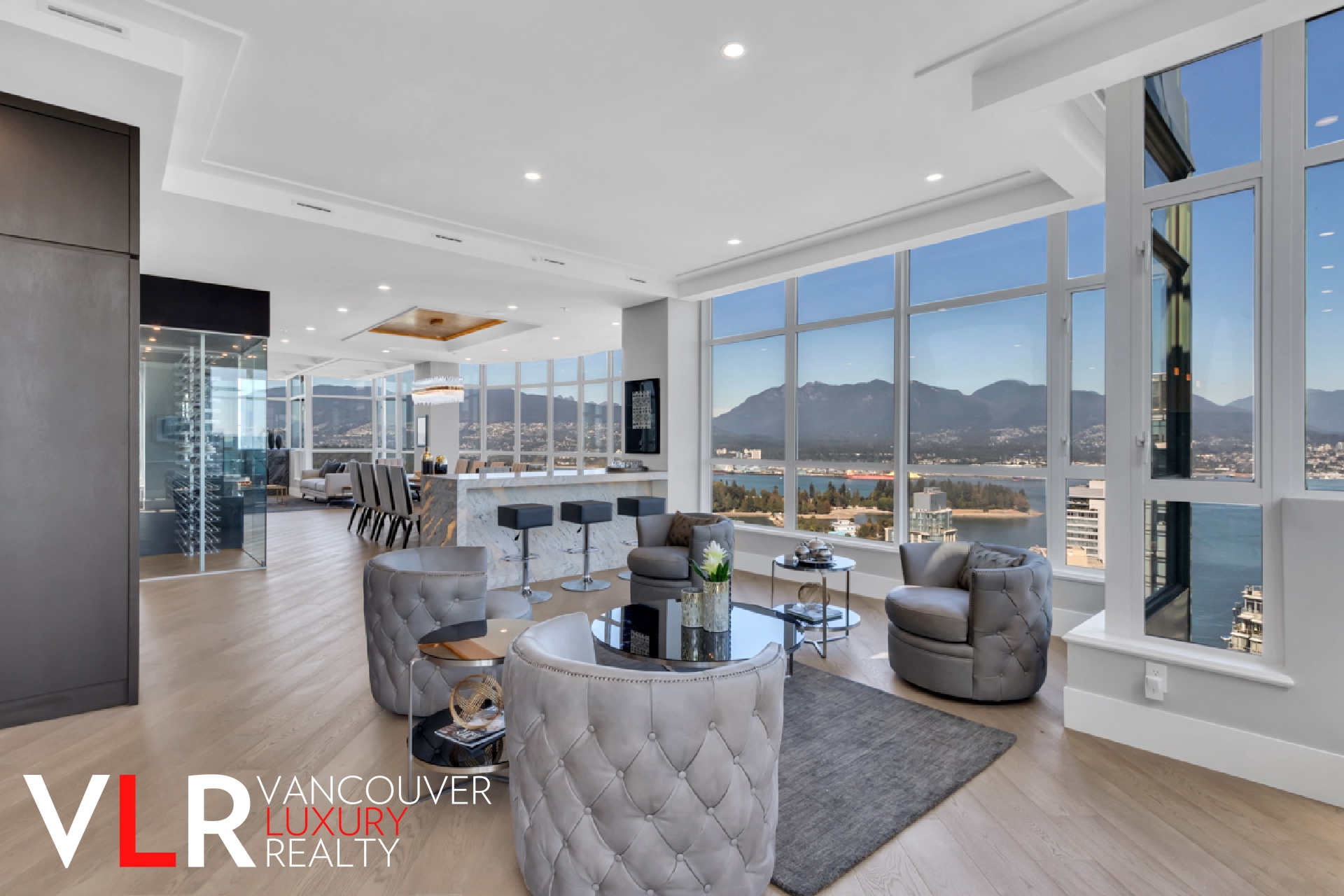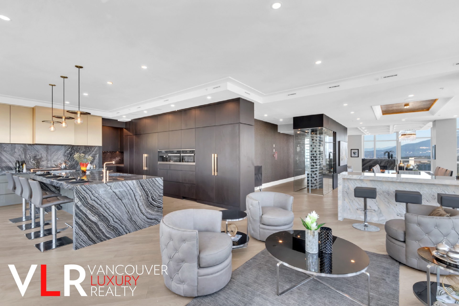 The living room features some of the best VIEWS Vancouver has to offer, never ending water and mountain views, also a custom gas fireplace set in black stripped marble finish and coffered ceilings are just some of the many features of the living room.