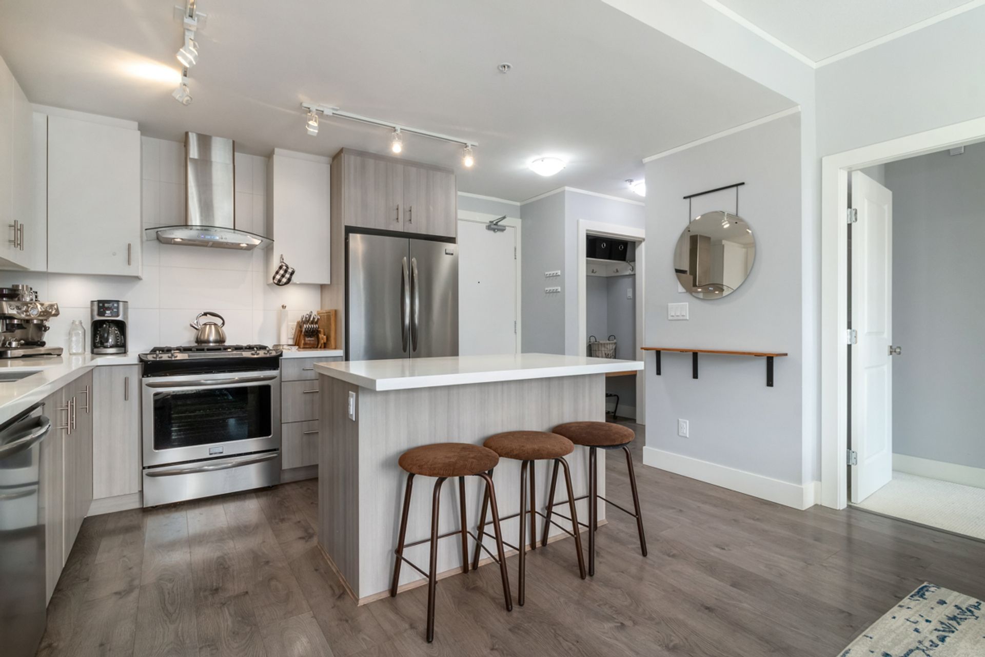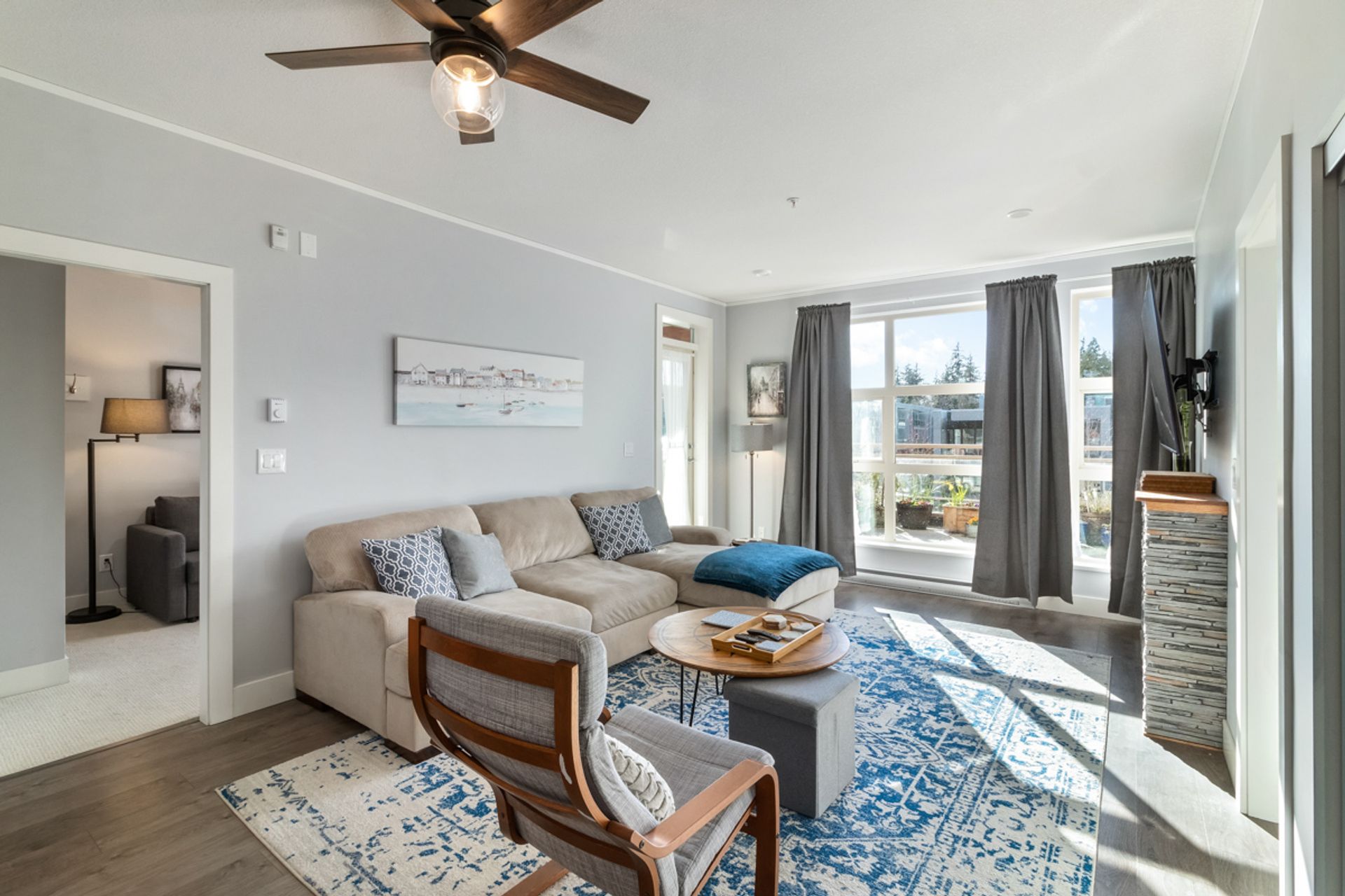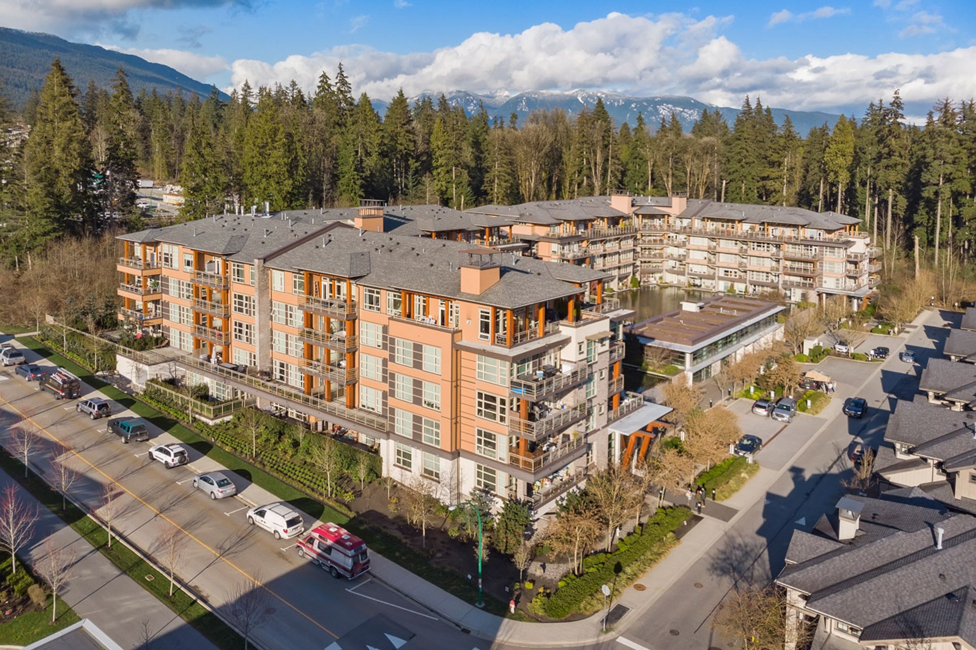 Welcome to Destiny 2 at Ravenwoods. Stunning 896 SQFT 2 bed 2 bathroom home. Open Concept light filled living space with 9' ceilings throughout. Large open Kitchen features, s/s appliances, gas range & quartz countertops. Large primary bedroom with walks tru closet & 5 piece ensuite bathroom. Perfect 2nd bedroom with full 2nd bathroom. Amazing 338 sqft partially covered west facing deck.This contemporary collection of homes are nestled in a forested setting, surrounded by beaches & mountains, within walking distance to restaurants, golf, coffee shops & more. Just a short driving distance to Downtown, Park Royal Mall & Deep Cove. Great amenities include infinity pond, fitness centre & clubhouse.Pets/ Rental w/ rest. 2 parking. Showings at open house Sat/Sun May 7th/8th 2:30-4pm. storage.