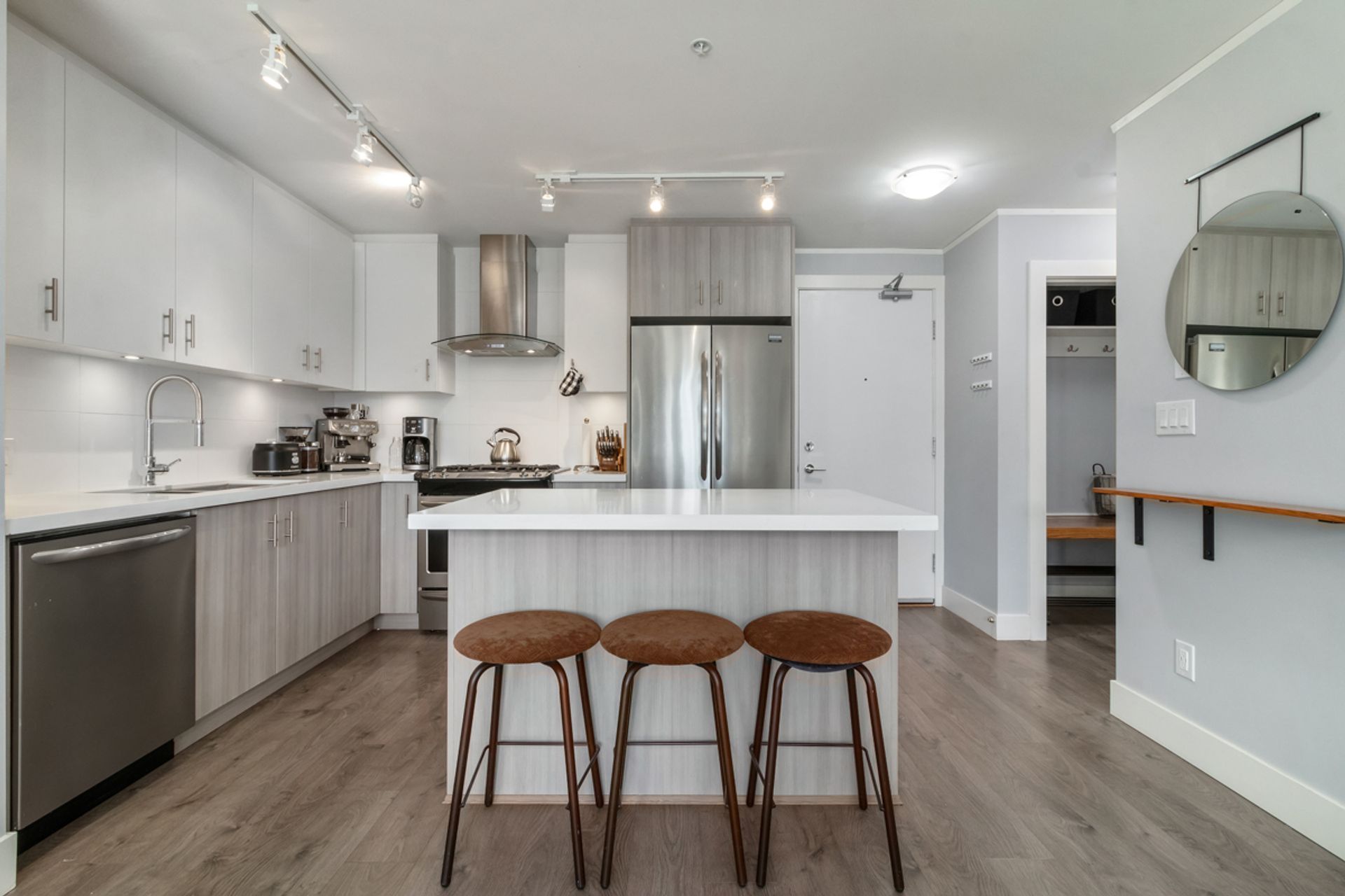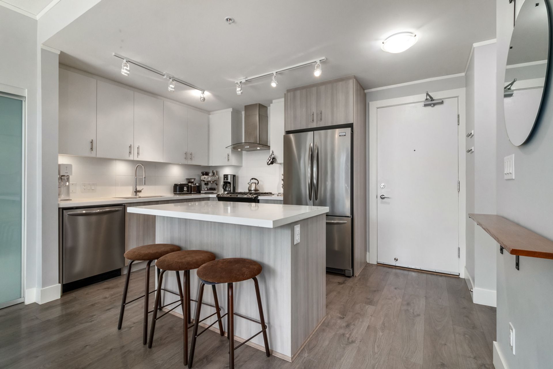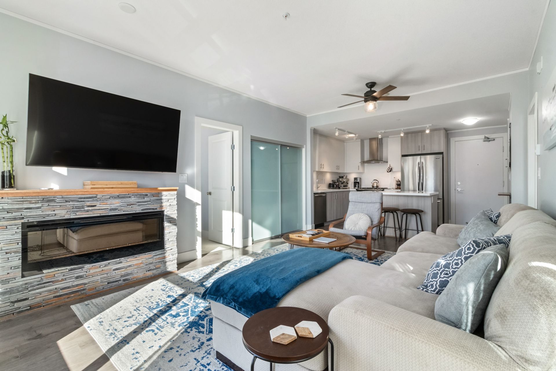 Welcome to Destiny 2 at Ravenwoods. Stunning 896 SQFT 2 bed 2 bathroom home. Open Concept light filled living space with 9' ceilings throughout. Large open Kitchen features, s/s appliances, gas range & quartz countertops. Large primary bedroom with walks tru closet & 5 piece ensuite bathroom. Perfect 2nd bedroom with full 2nd bathroom. Amazing 338 sqft partially covered west facing deck.This contemporary collection of homes are nestled in a forested setting, surrounded by beaches & mountains, within walking distance to restaurants, golf, coffee shops & more. Just a short driving distance to Downtown, Park Royal Mall & Deep Cove. Great amenities include infinity pond, fitness centre & clubhouse.Pets/ Rental w/ rest. 2 parking. Showings at open house Sat/Sun May 7th/8th 2:30-4pm. storage.