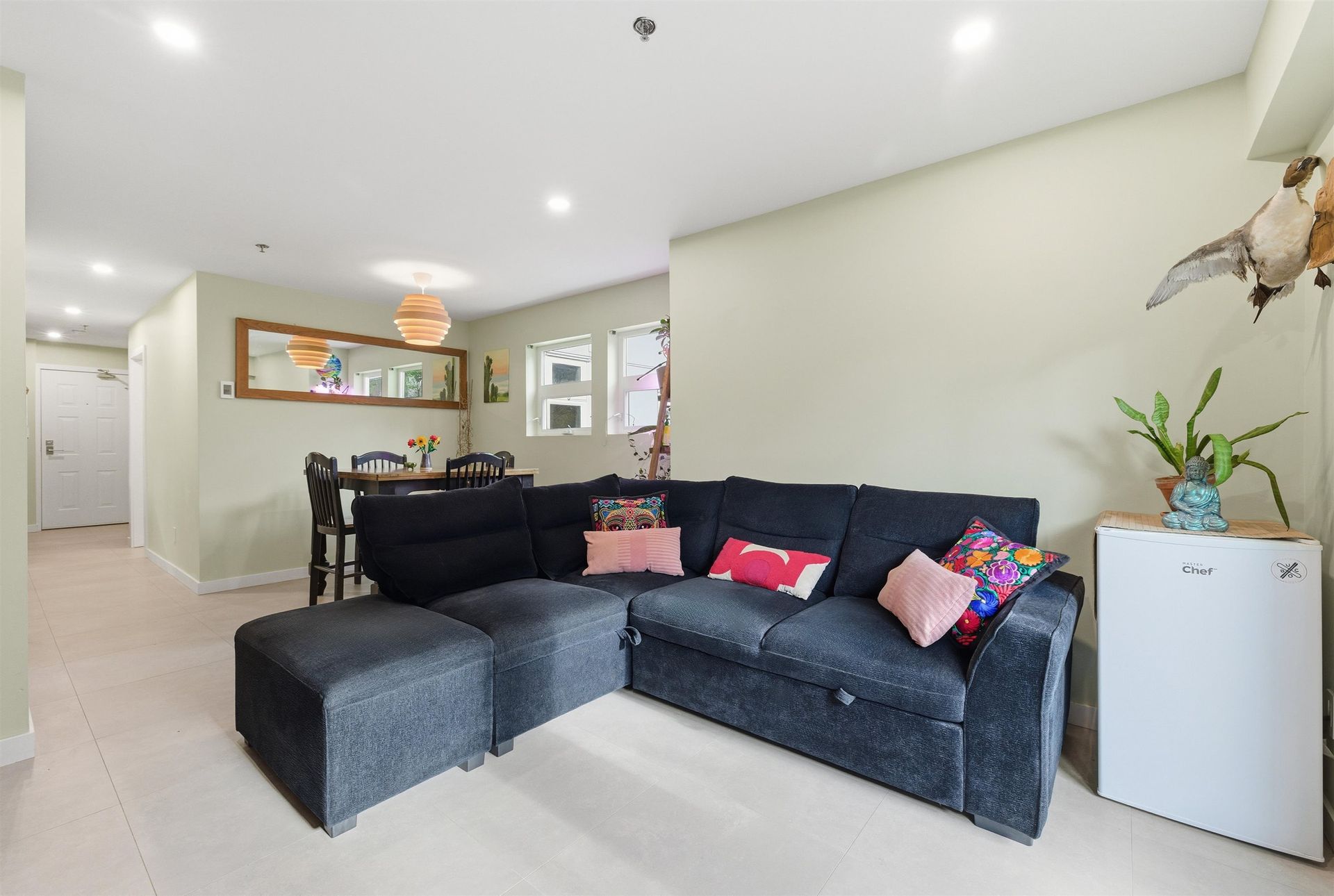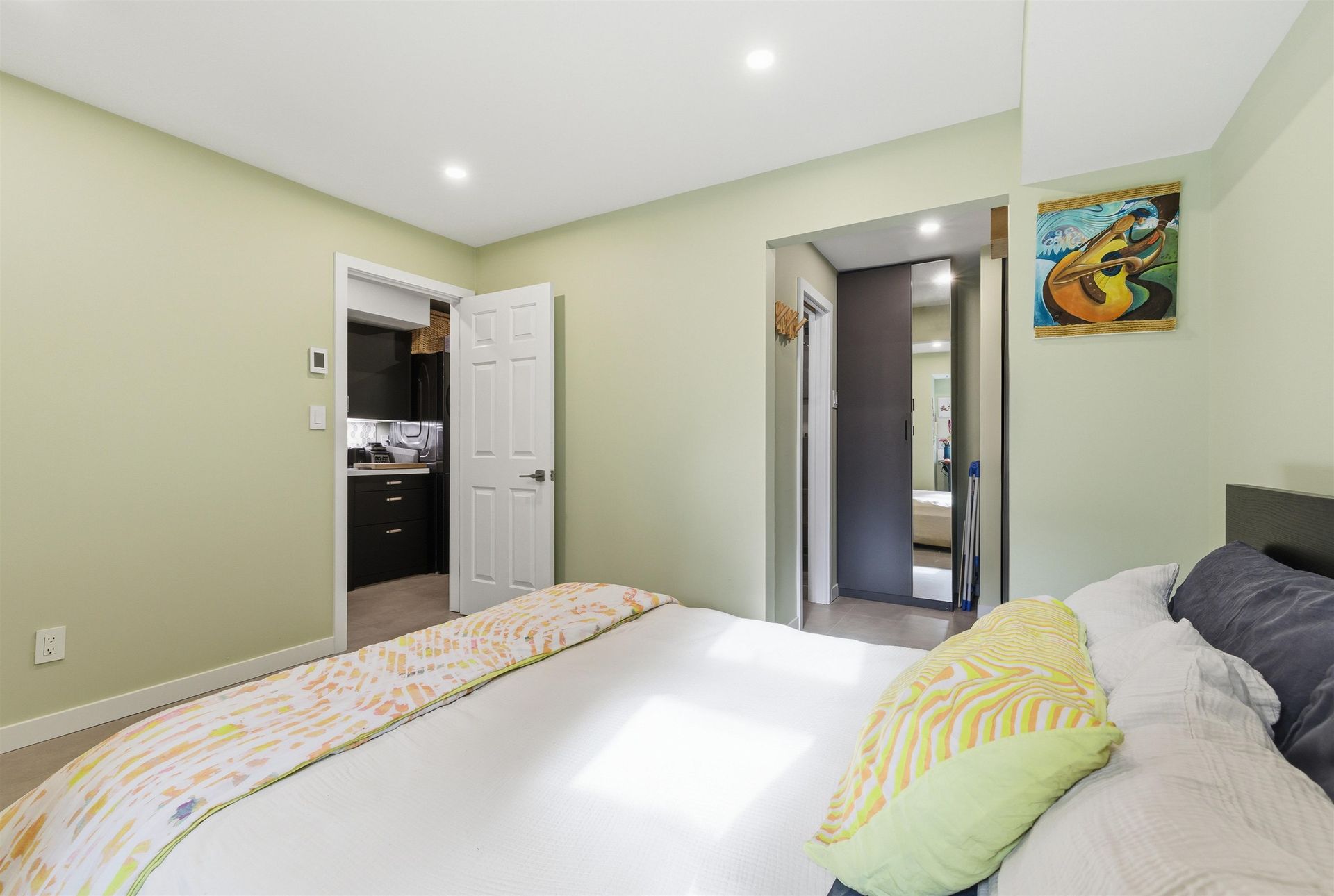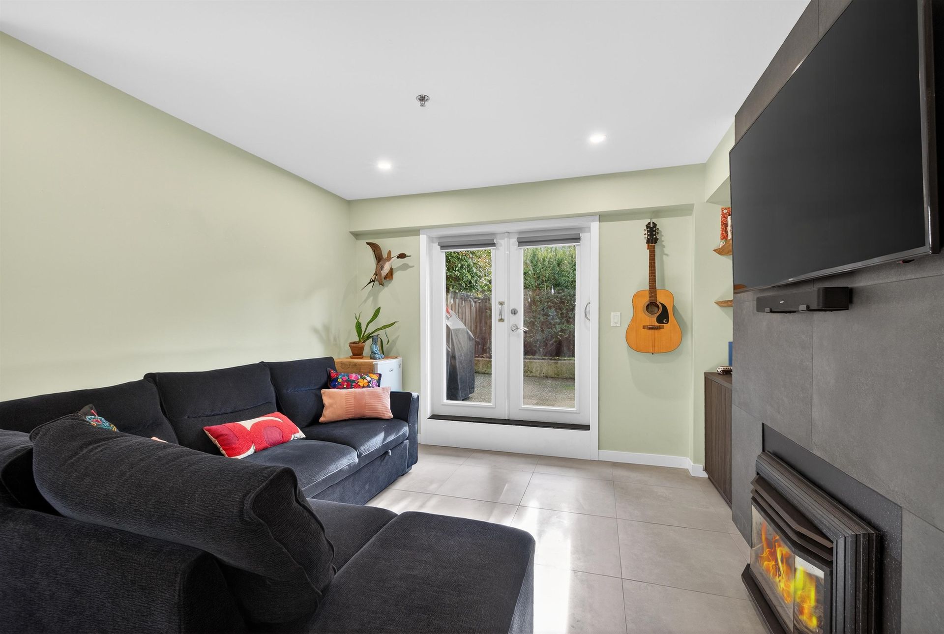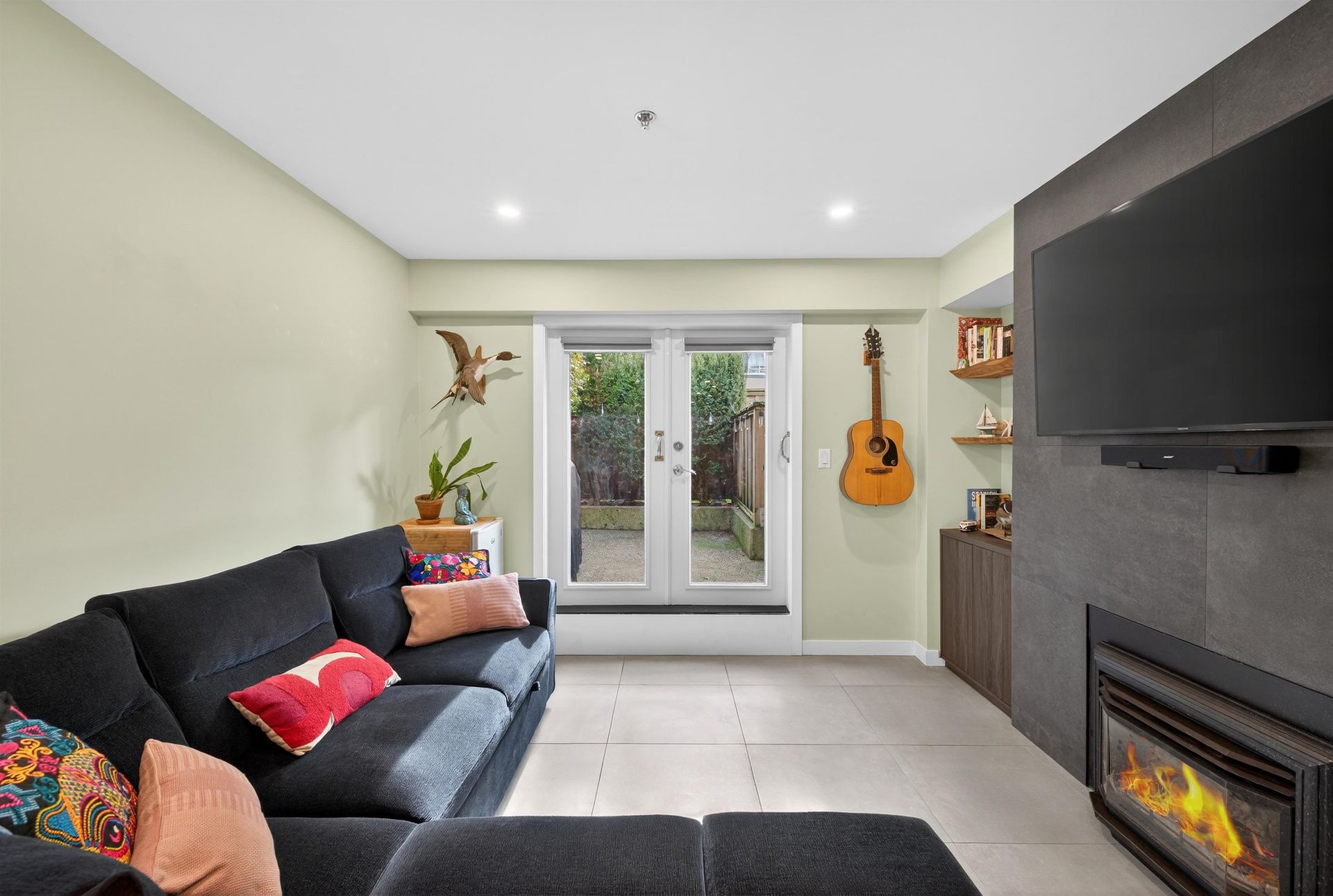 Completely renovated and truly move-in ready, this 1-bed, 1-bath ground-floor home offers bright south/east exposure and quality updates throughout. Enjoy radiant heated tile floors, a brand-new kitchen with green cabinets, stone counters, and new appliances. Spacious bedroom with walk-through closet w beautiful ensuite featuring a frameless glass shower, floating vanity, and backlit vanity /mirror. Comfortable living room with gas fireplace, custom storage, and live-edge shelving, plus in-suite laundry. Steps to shopping, City Hall, the Canada Line, and great dining.
